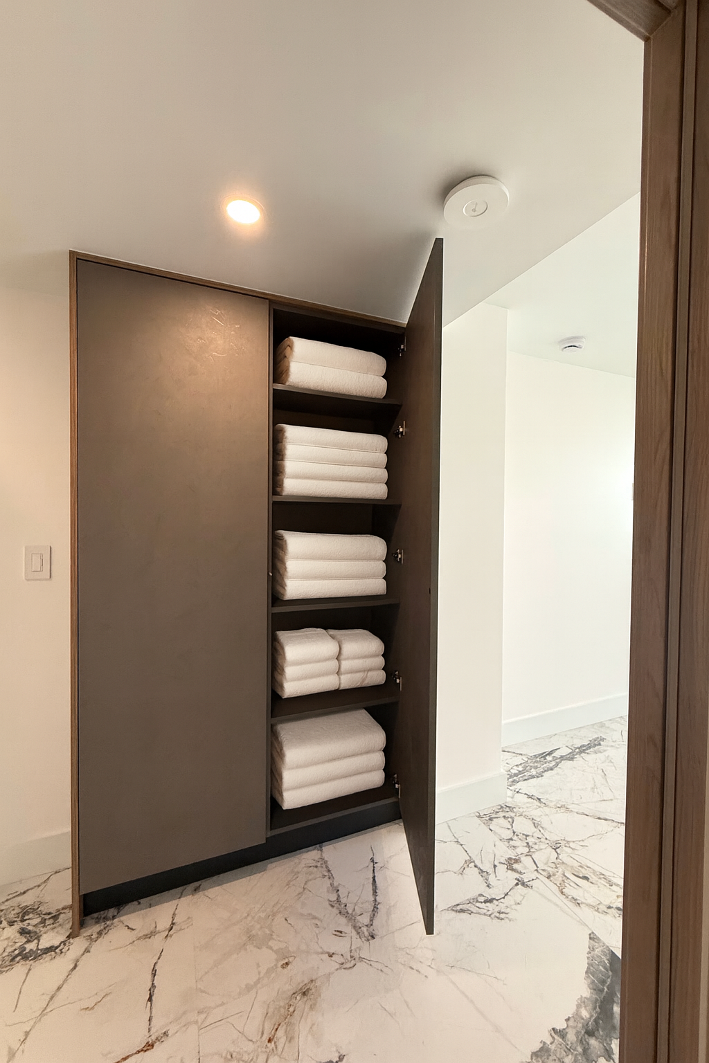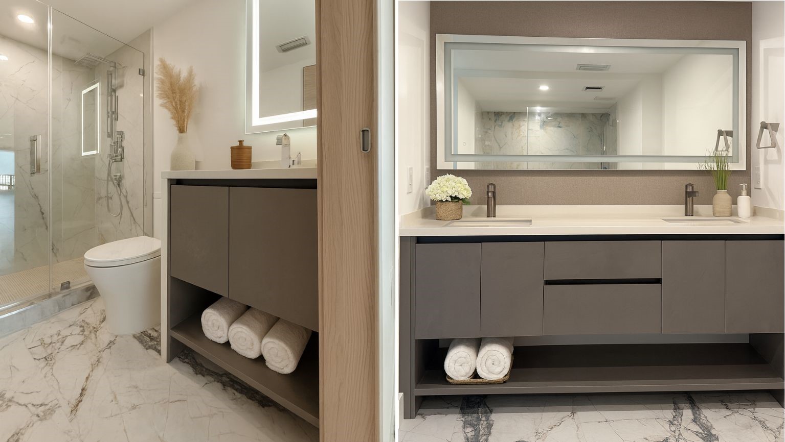 The bathrooms feature large-format porcelain slabs that mimic natural marble, paired with spa-like details such as integrated lighting, open shelf vanities, and frameless glass showers. We also designed and installed charcoal stone look cabinets to keep the bathrooms modern, minimal, and functional.