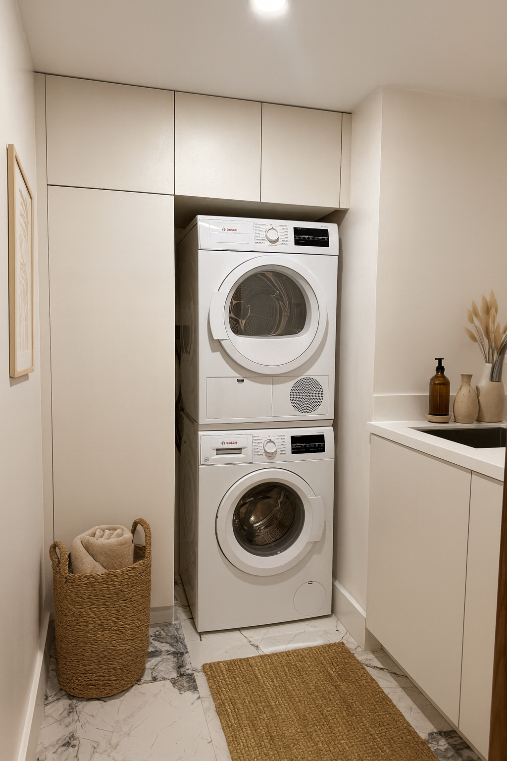 We also designed custom built-in cabinetry in the foyer, which cleverly includes a hidden door to the laundry room. The laundry space itself was fully built out with custom storage and integrated appliances, blending beauty with everyday functionality.