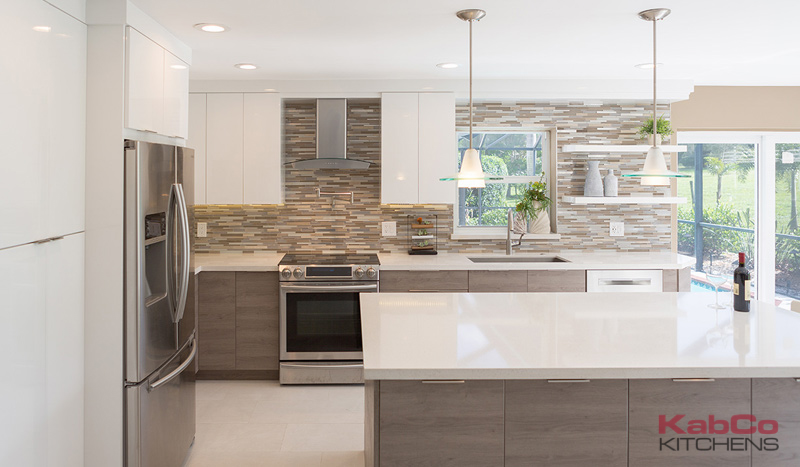 An expanded new floor plan was created using a combination of Miralis custom cabinets in two distinct finishes. A must have for this design was a large island with seating. This was created by removing a peninsula wall and creating a sleek island. A slight overhang was added allowing for seating and more counter space. This inviting new kitchen offers style, storage and function making this remodel a success.