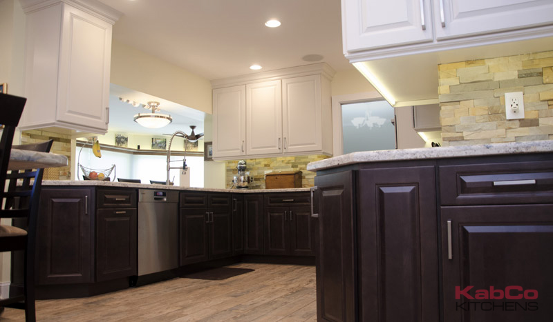KabCo Kitchens created a warm rustic kitchen using Homecrest Cabinetry in two tones. Cabinet finishes; Maple French Vanilla and Maple Buckboard were both used in a Montella door style. Delicatus Granite countertops were used throughout the kitchen. The large island was custom build with decorative beadboard in Maple Buckboard and topped with Green Fusion granite. Outdoor tile was used as backsplash for the added rustic look.