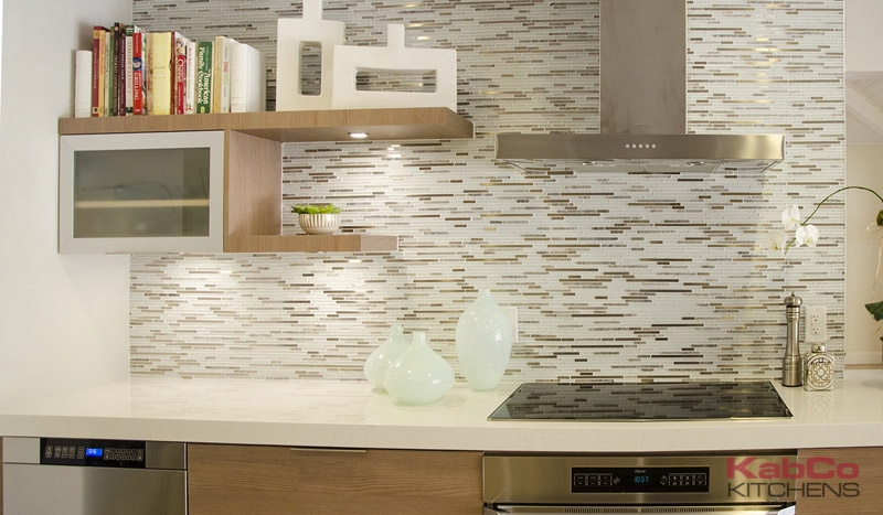 A galley kitchen with seamless elegance and a modern edge. It features custom frameless cabinets by Miralis in their Sahara color with Horizontal Grain. Open shelves and horizontal glass cabinets accent this long space. Flush stainless steel appliances and Carrera quartz counters were also integrated into this streamline design for a clean modern look.