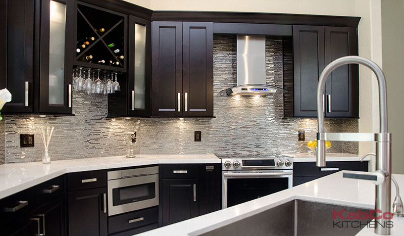 This Kitchen retreat was created using Waypoint Cabinets in Maple Espresso and contrasting Quartz Counters in Snow. This layout is the sleek, ample and functional design the homeowners dreamed of. It is beautiful on the outside and smart on the inside. Functionality and Storage were added to every last inch. A wine cubby with stem glass holder, double garbage bin, pull out spice racks, wall message center, pantry with roll outs, cutlery dividers were incorporated to name a few. Stainless Steel appliances and back splash are a fine compliment to this space.